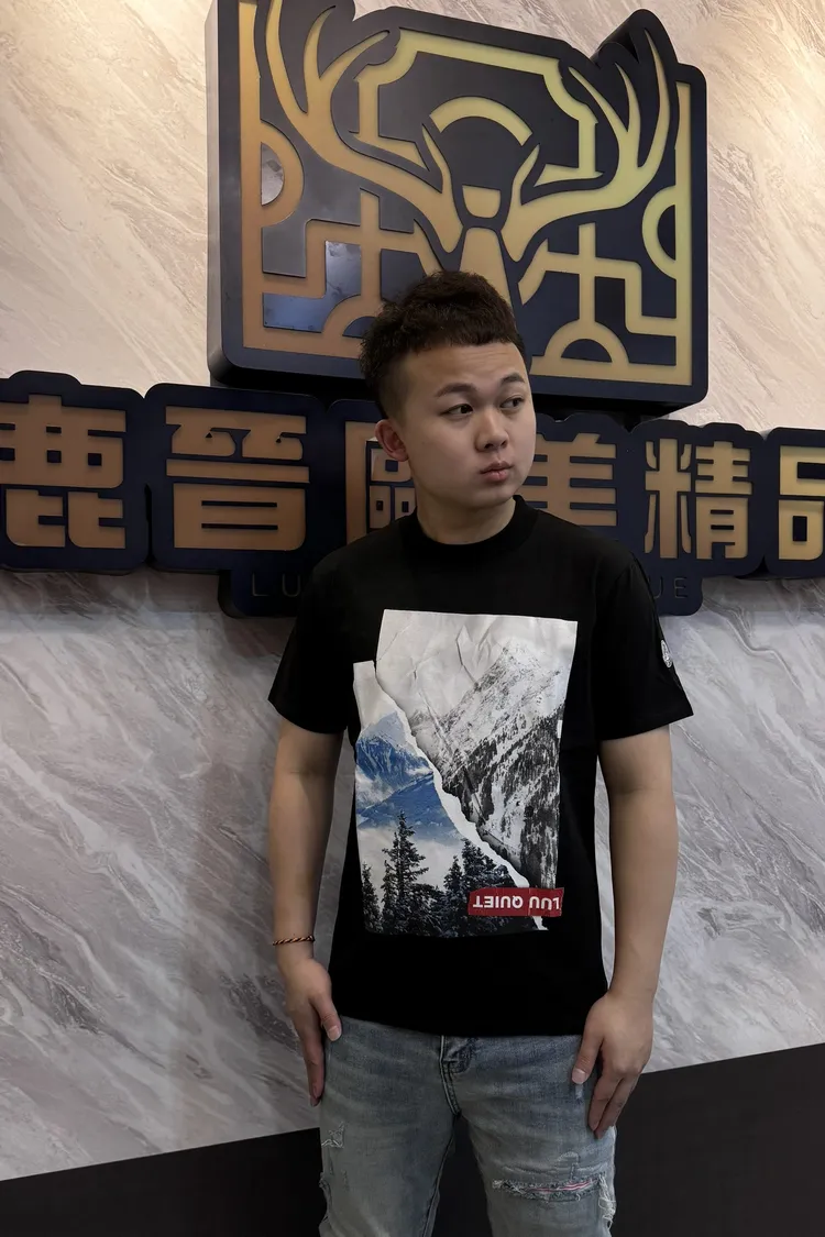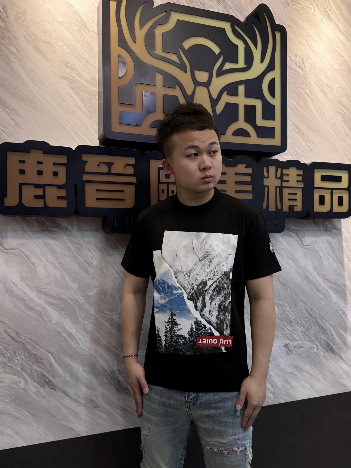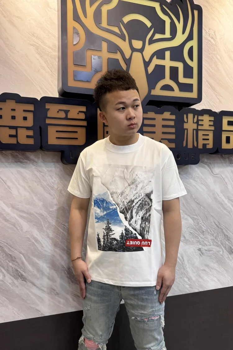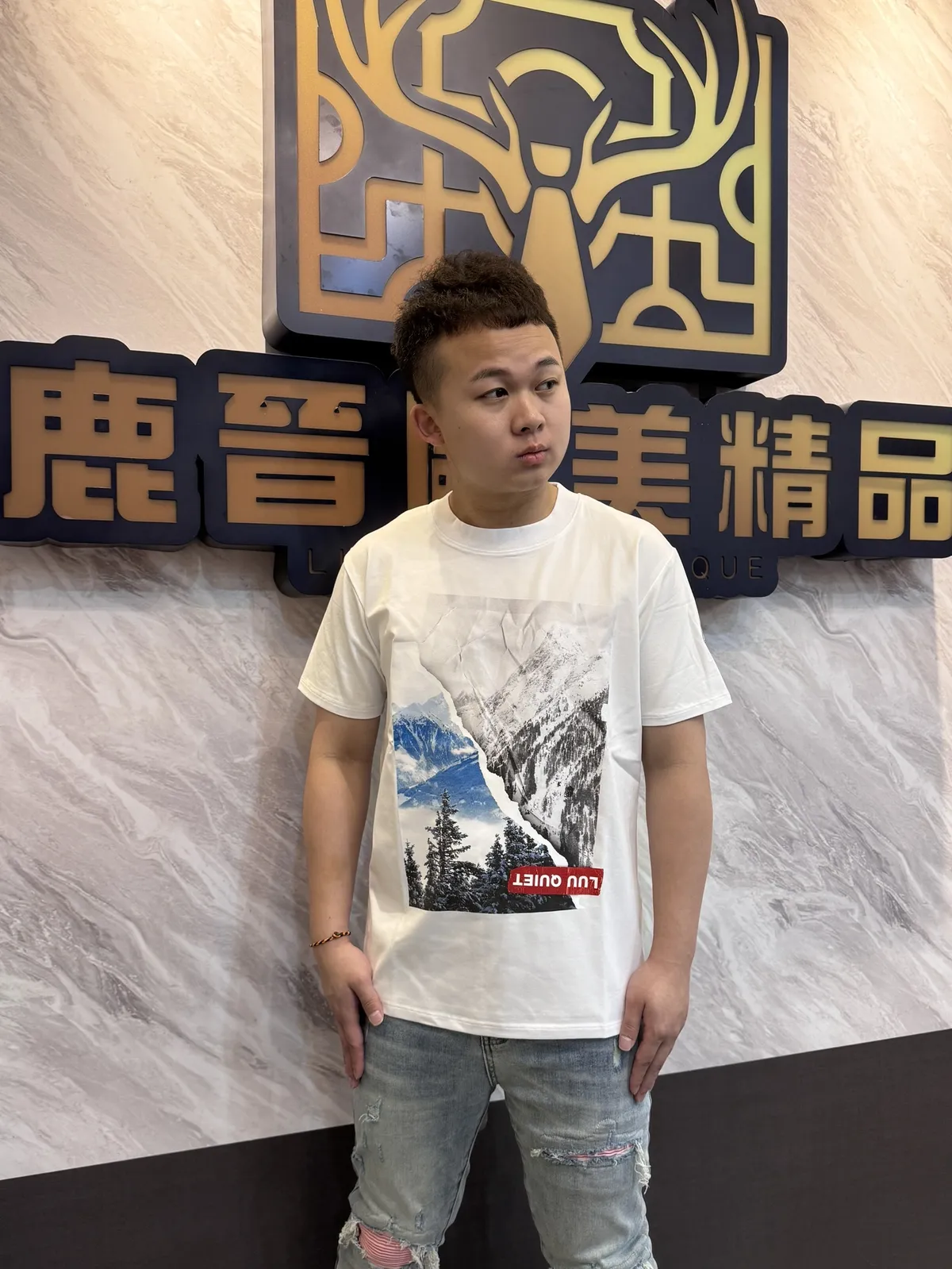 【Luu Quiet】灰藍山景畫手臂品牌徽章短袖