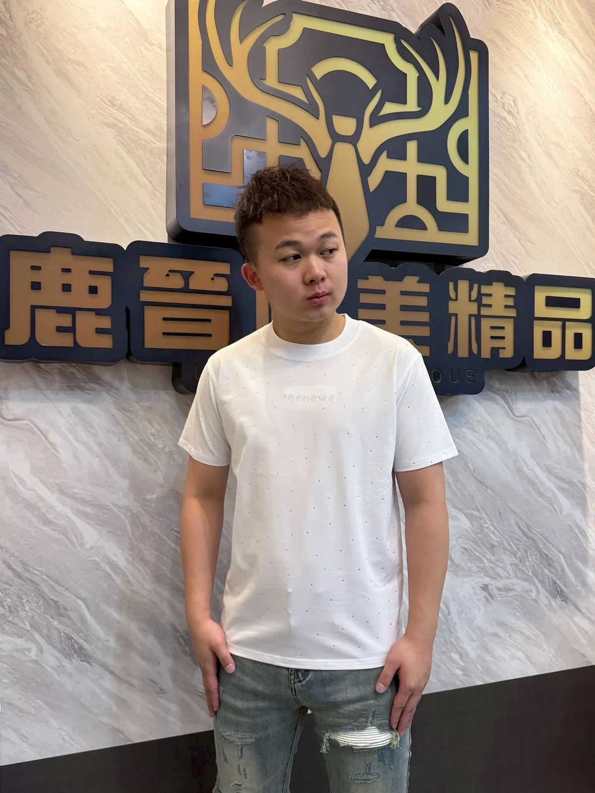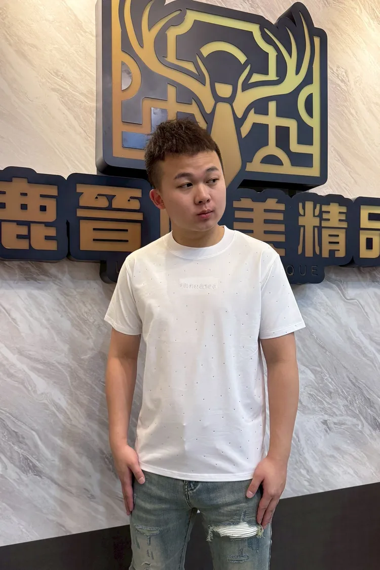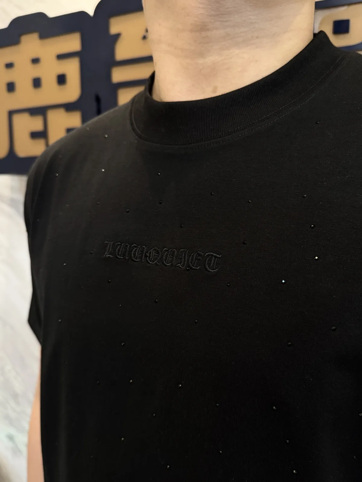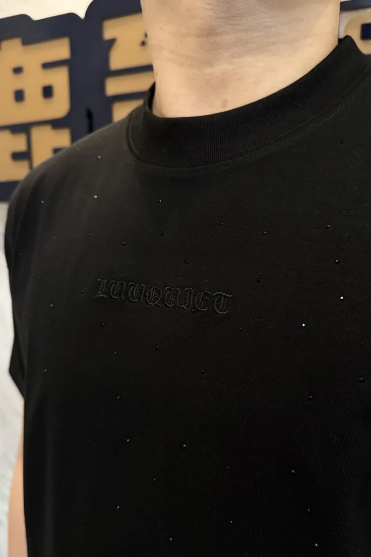 【Luu Quiet】滿版點綴珠中間品牌徽章短袖T恤