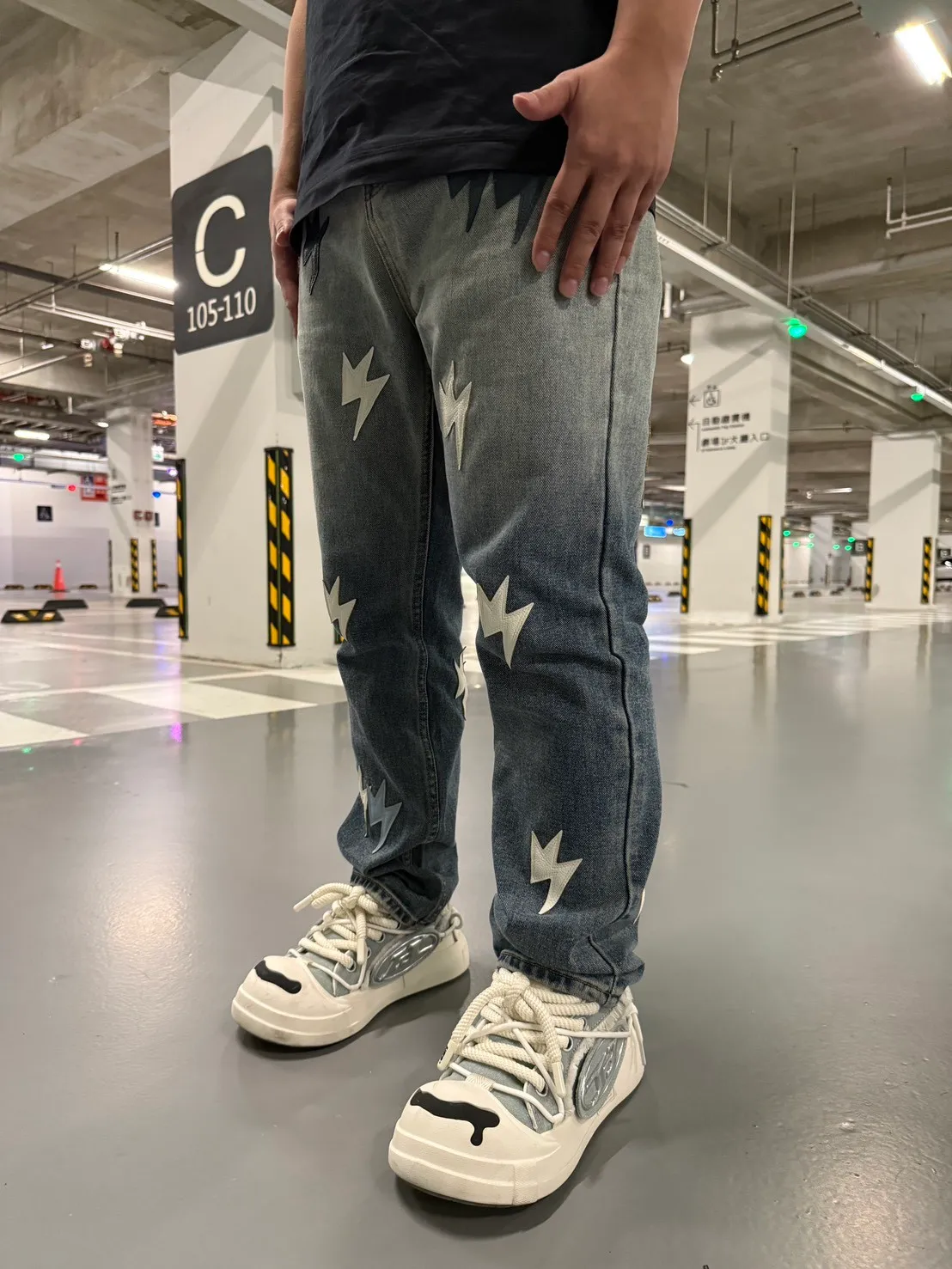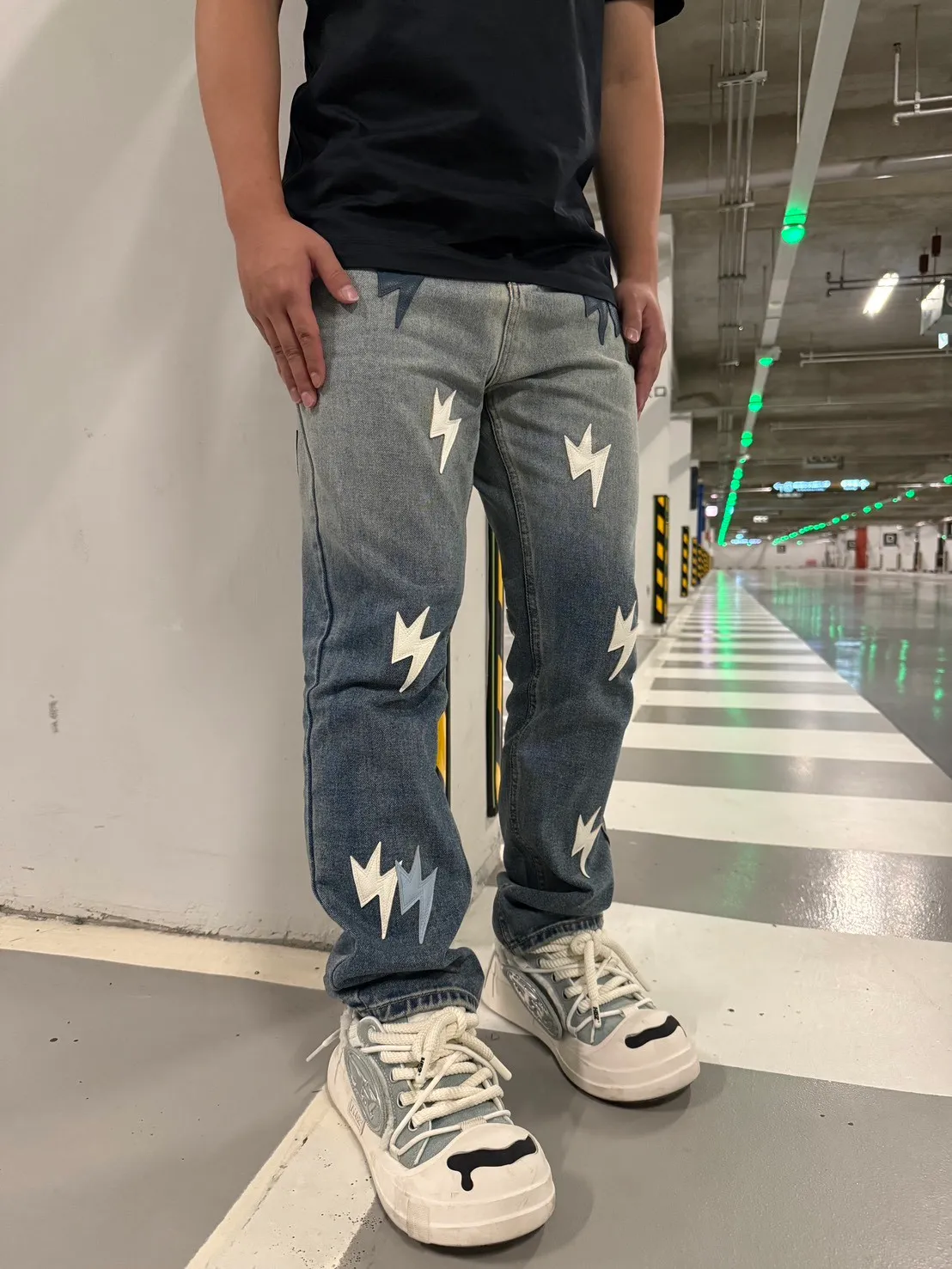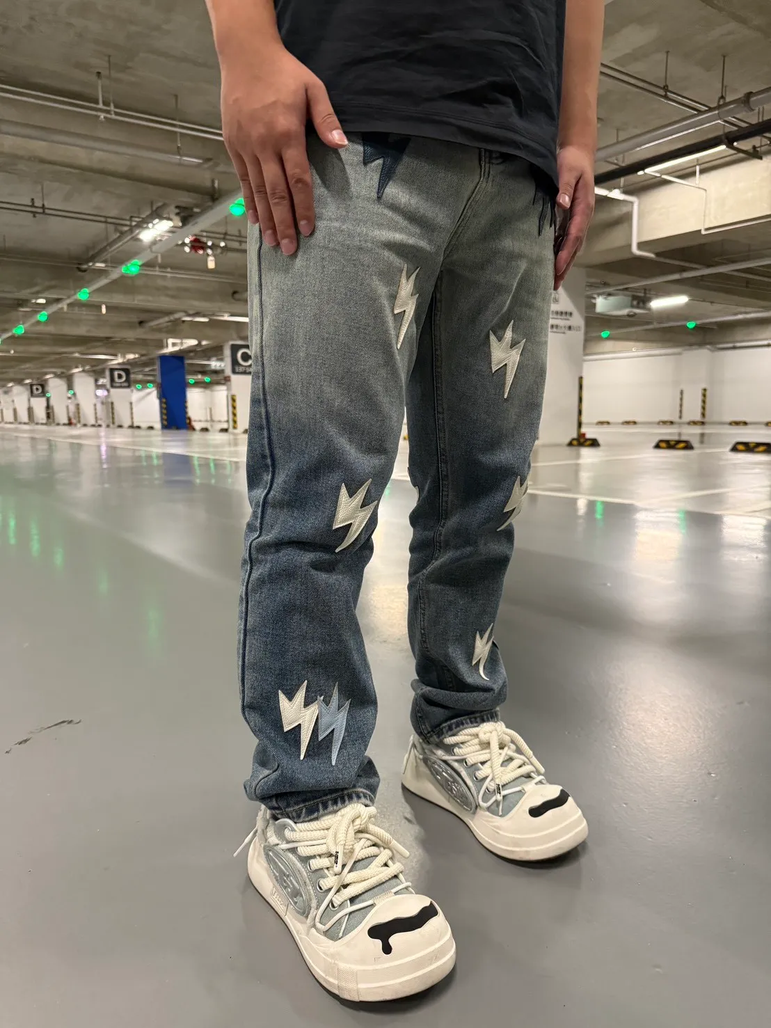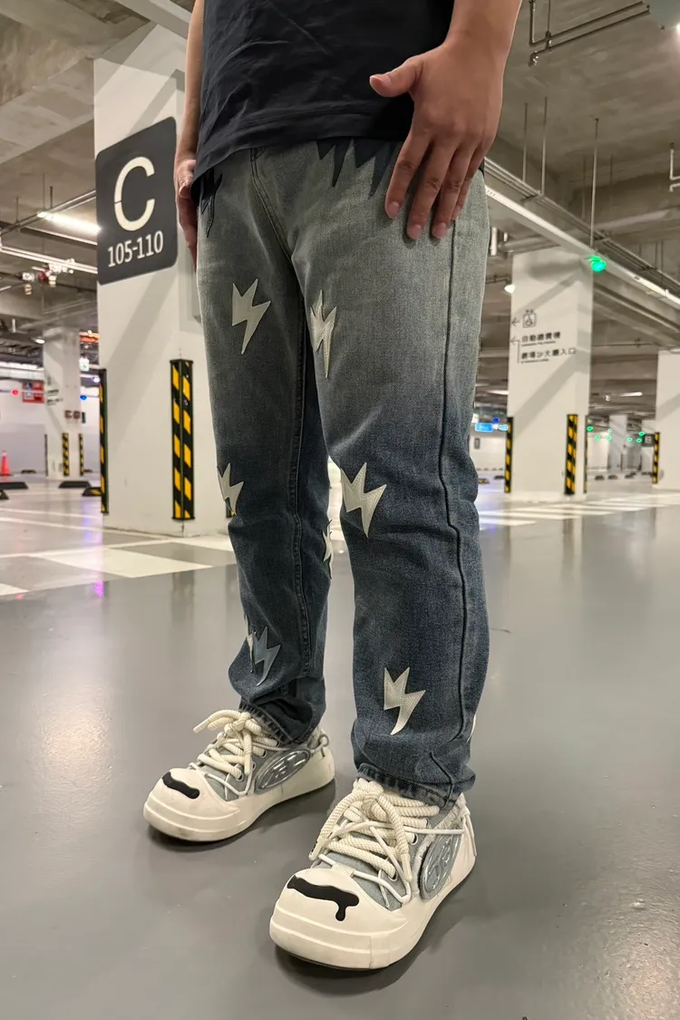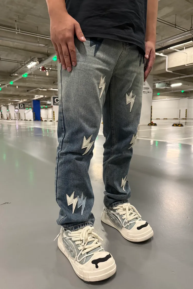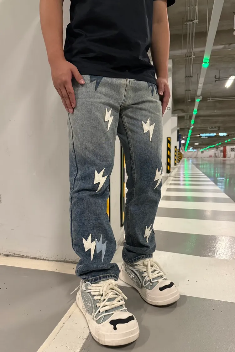 【Luu Quiet】LJ019漸層藍閃電彈力直筒牛仔褲