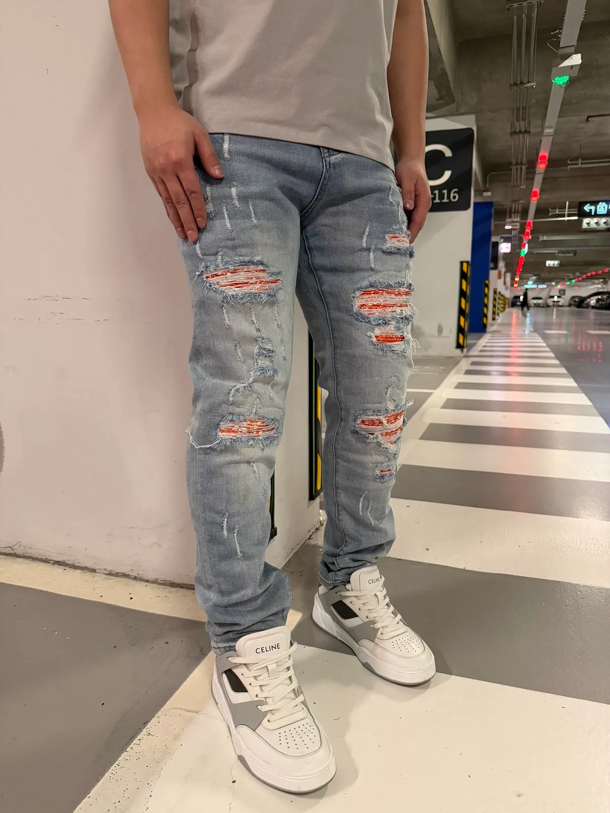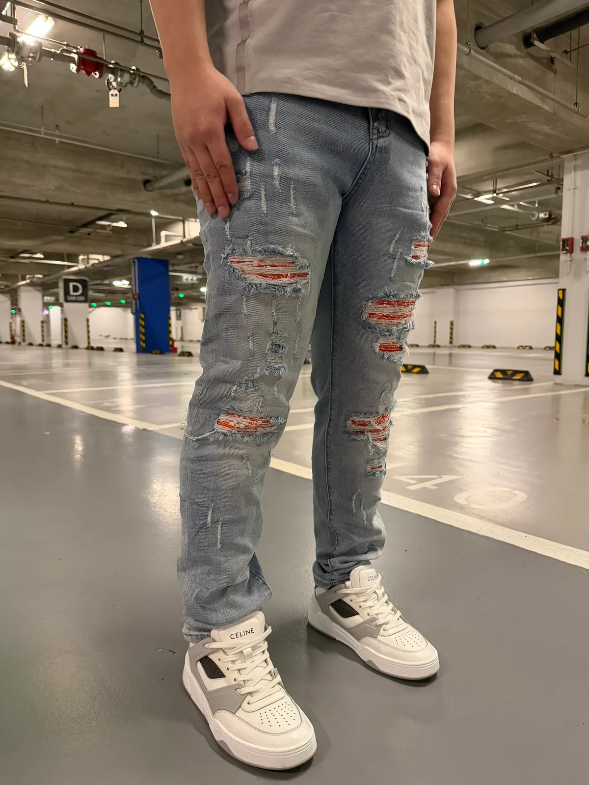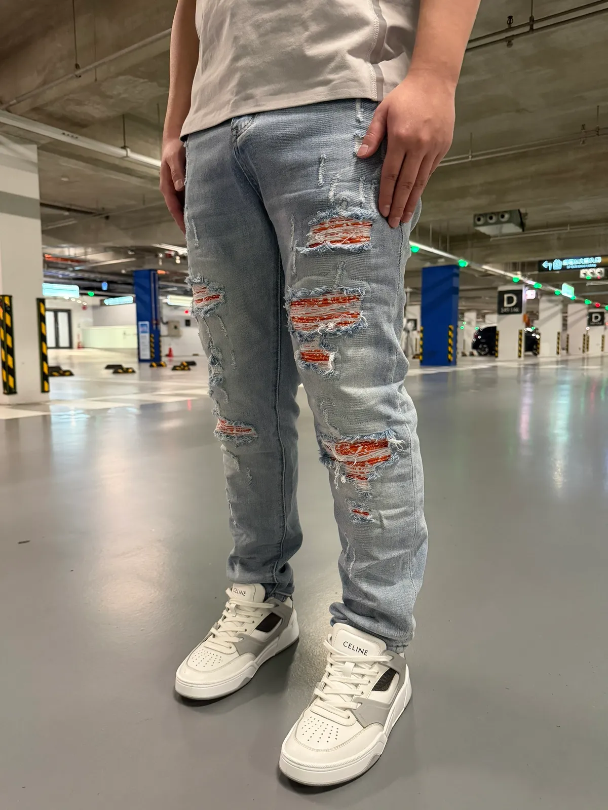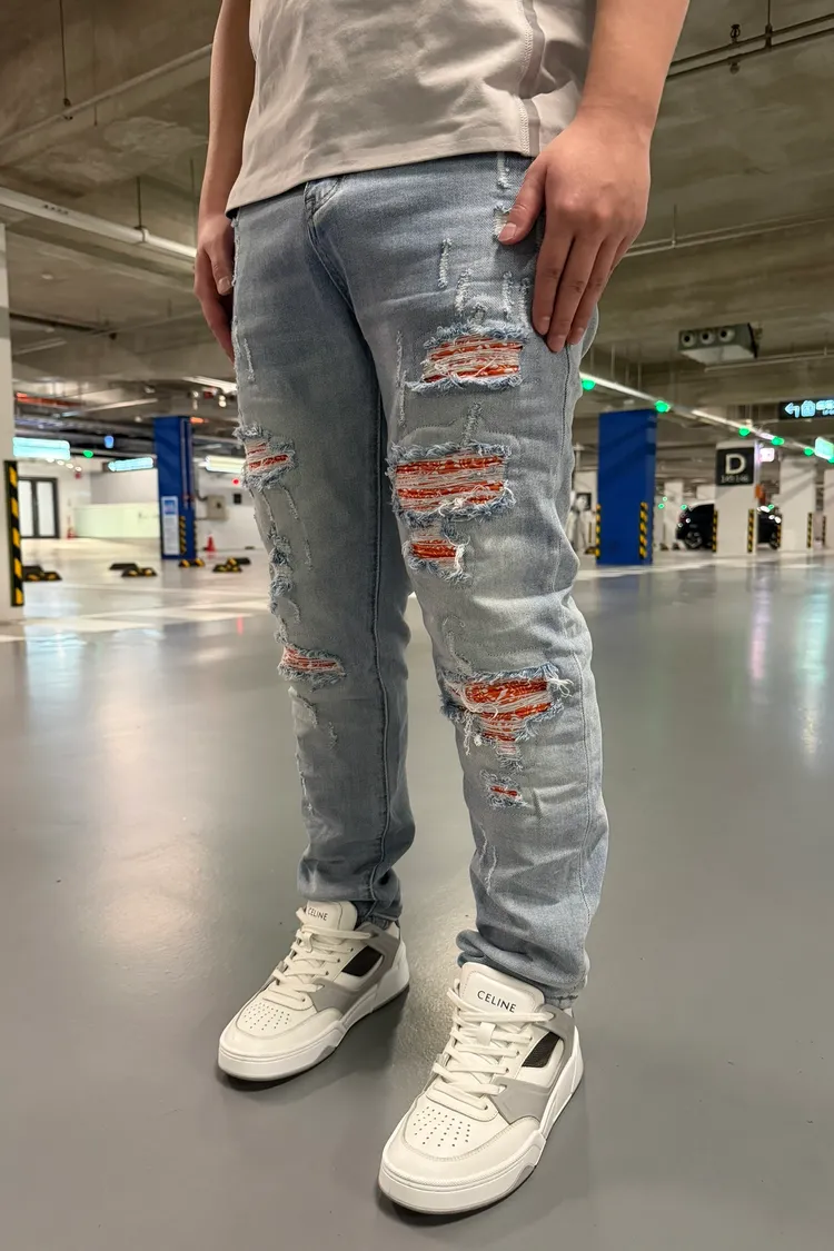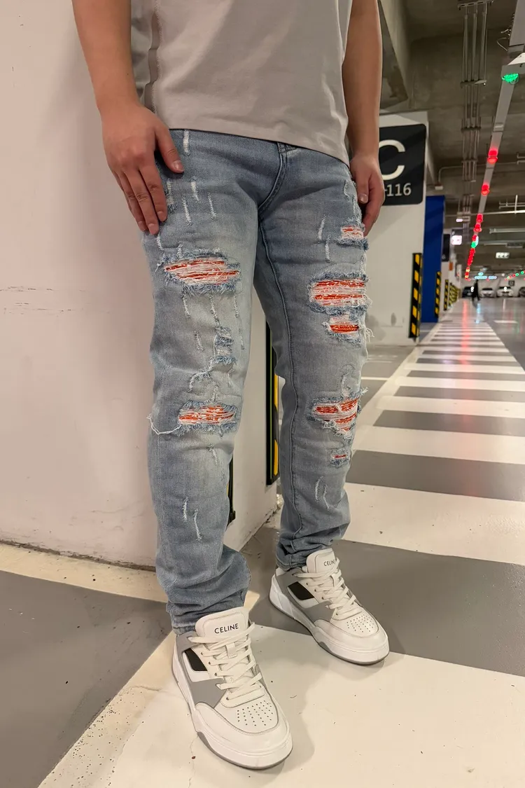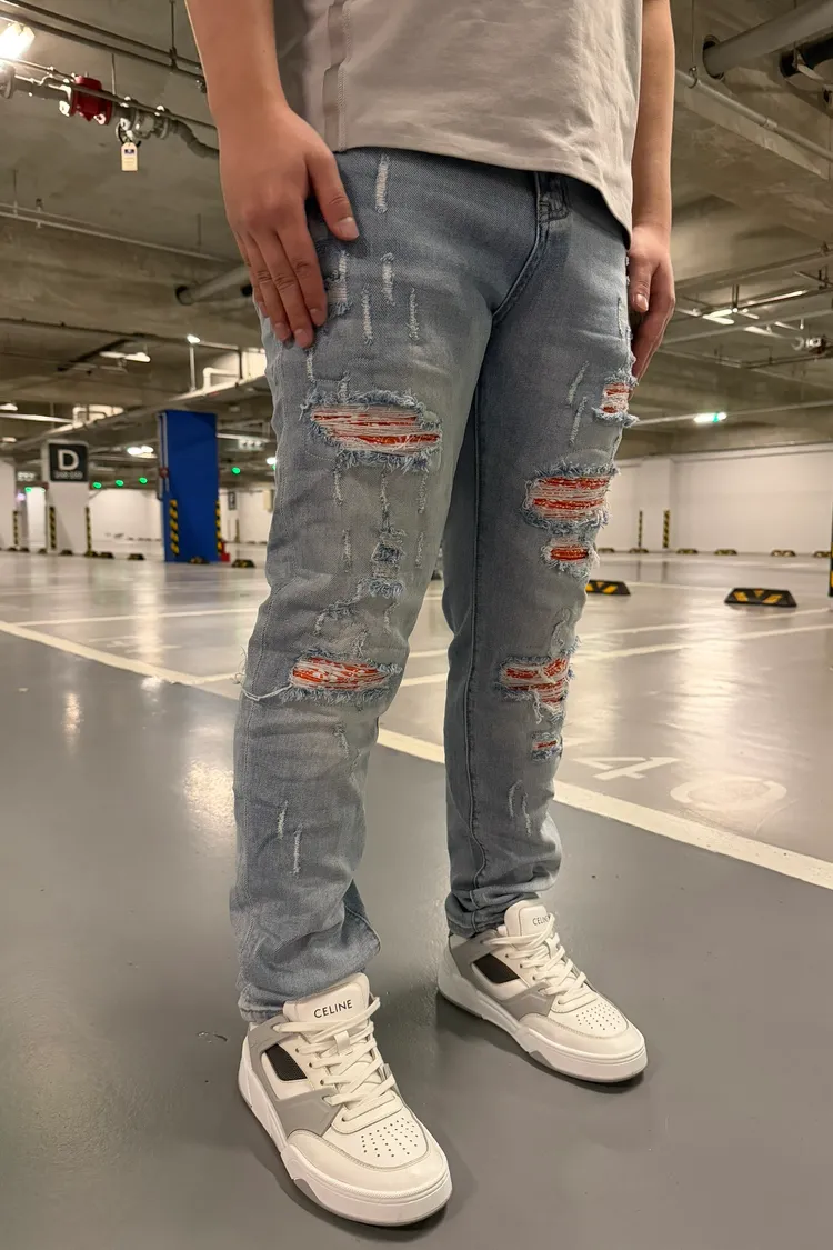 【Luu Quiet】L027 淺藍底橘腰果花壓皺牛仔褲