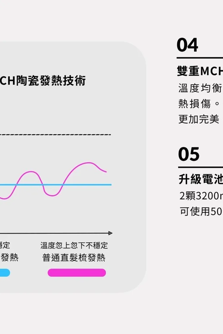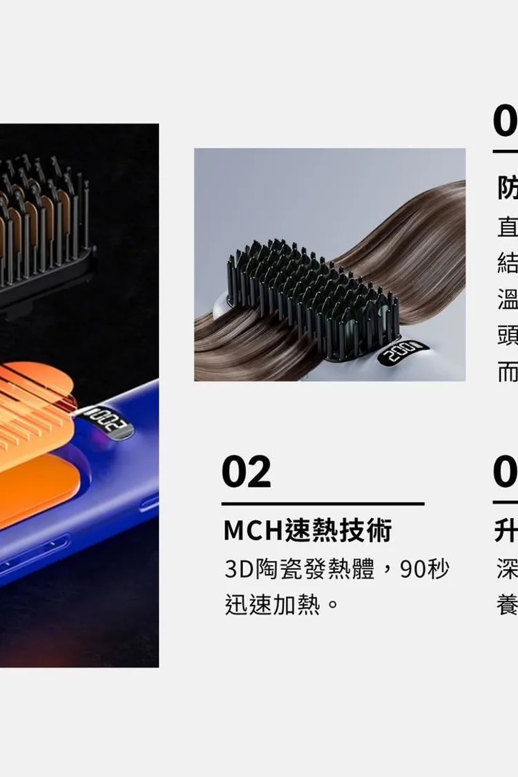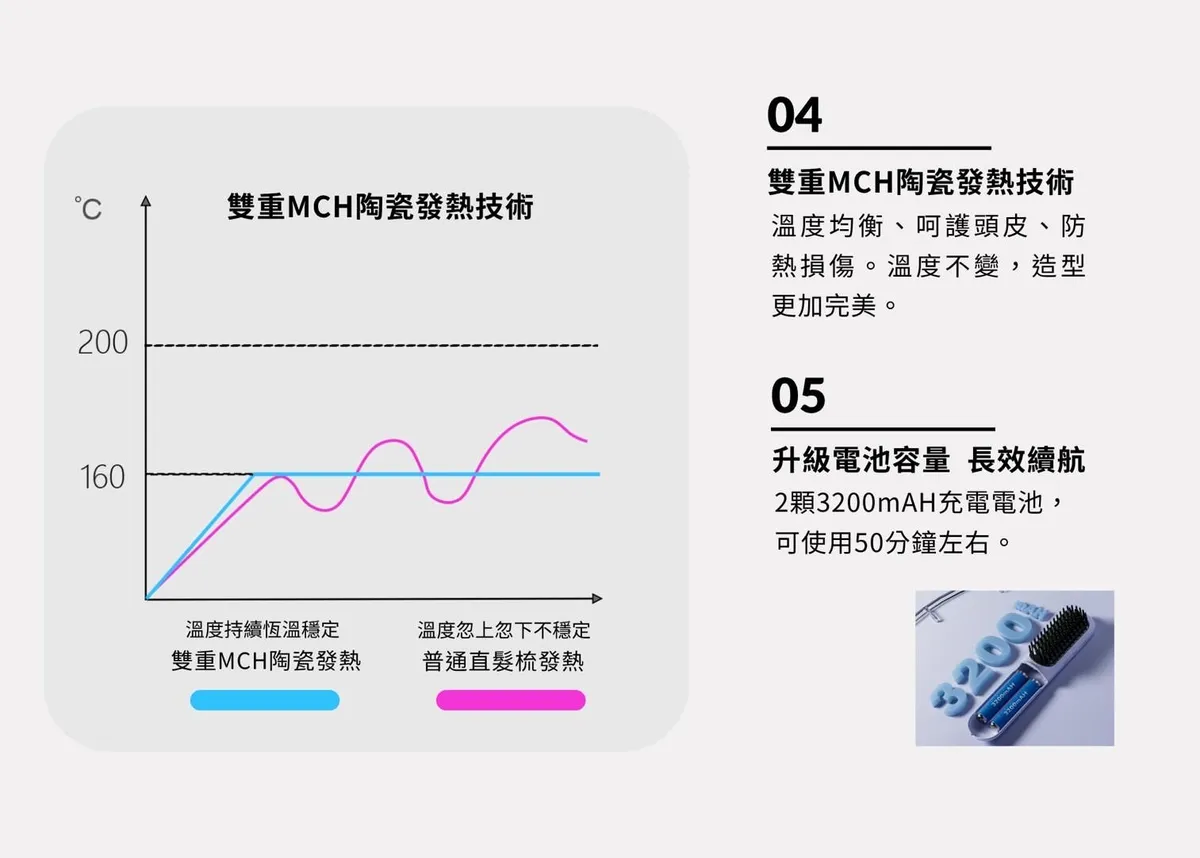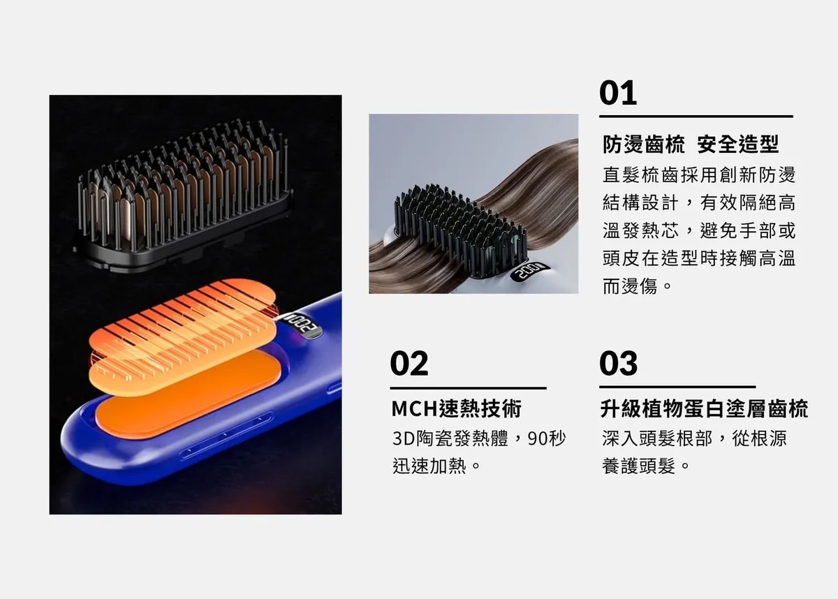 直髮梳齒採用創新防燙結構設計,有效隔絕高溫發熱芯,避免手部或頭皮在造型時接觸高溫而燙傷。